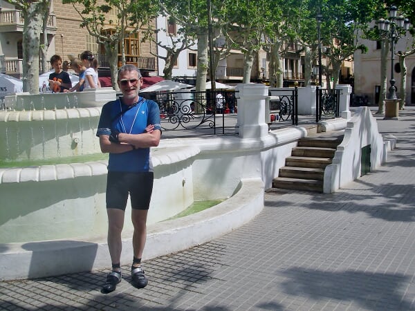 This was supposed to be an easier day but it didn’t feel like it, mainly due to the heat which affected me quite badly. Took the very pleasant roads to Campanet, where Al and I somehow mislaid the others so we stopped for a lengthy coffee. We then headed towards the lovely wee town of Sa Pobla, Al made me go into the centre (I would have gone round the by-pass) and I’m very glad he did as it was lovely. A big square, the usual cafes and just a great atmosphere with a gang of pre-school children playing ‘football’ very happily. What a nice place. Then we were off to Petra via and interesting quiet route and it got seriously hot with the thermometer peaking at 35 degrees Celsius. I suffered a lot over the last few miles and was glad to fetch up at the same cafe as last year, with the same friendly service and good coffee. You can tell it’s a good place to stop when they put a plate of segmented oranges in front of you as soon as you sit down without even asking and at the end will fill your water bottles with ice & cold water from their private spring at no charge. They called it magic water but it didn’t work for me. The hundreds of cyclists (and bikes) in the square at Petra are an amazing sight. I doubt if it’ll catch on in Scotland, it’s just too cold and windy and rainy and midgy. Mallorca is a perfect place for a cycling holiday.