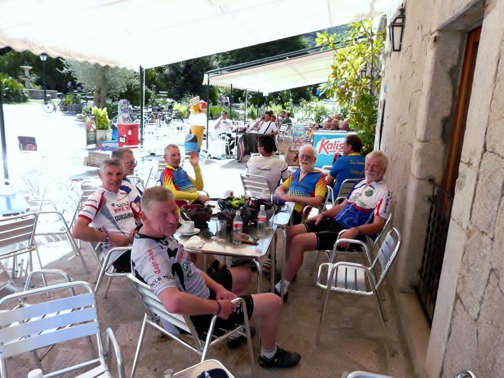 Today we took the pleasant country roads through the ‘foothills’ of the mountains as far as Alaro, coffee at Mancor and turned inland for lunch at Sencelles. The coffee stop was at an old fashioned bar with old men sitting outside, dreaming the morning away, a huge TV inside blaring away and a friendly host. Seven of us got drinks for nine euro’s including a slab of cake for each of us as ‘tapas’. We left ten, it seemed very cheap. We found some lovely unspoilt small roads and it got very hot (again). At our lunch stop, we hid in the shade of the church for a while before getting a drink at the cafe while watching the action in the square. The local police arrived, walked about a bit, gun in a holster and we wondered what was happening. Eventually, we found out as the school bus arrived and lots of kids got off while the policeman directed a couple of cars, once the kids were away and the bus gone the policeman got in his car and drove away, the day’s village action over. The return was via Alcudia which was a bit gnarly with narrow roads, heavy traffic and thousands of cyclists holding the traffic up. The patience of the Spanish drivers is outstanding. We were back to the hotel in good order feeling really good all day so I have got better from my stomach bug and got used to the heat. Fantastic day.