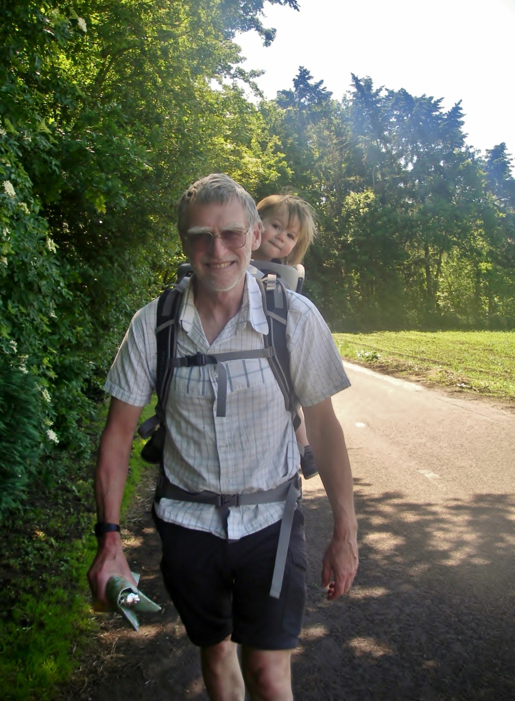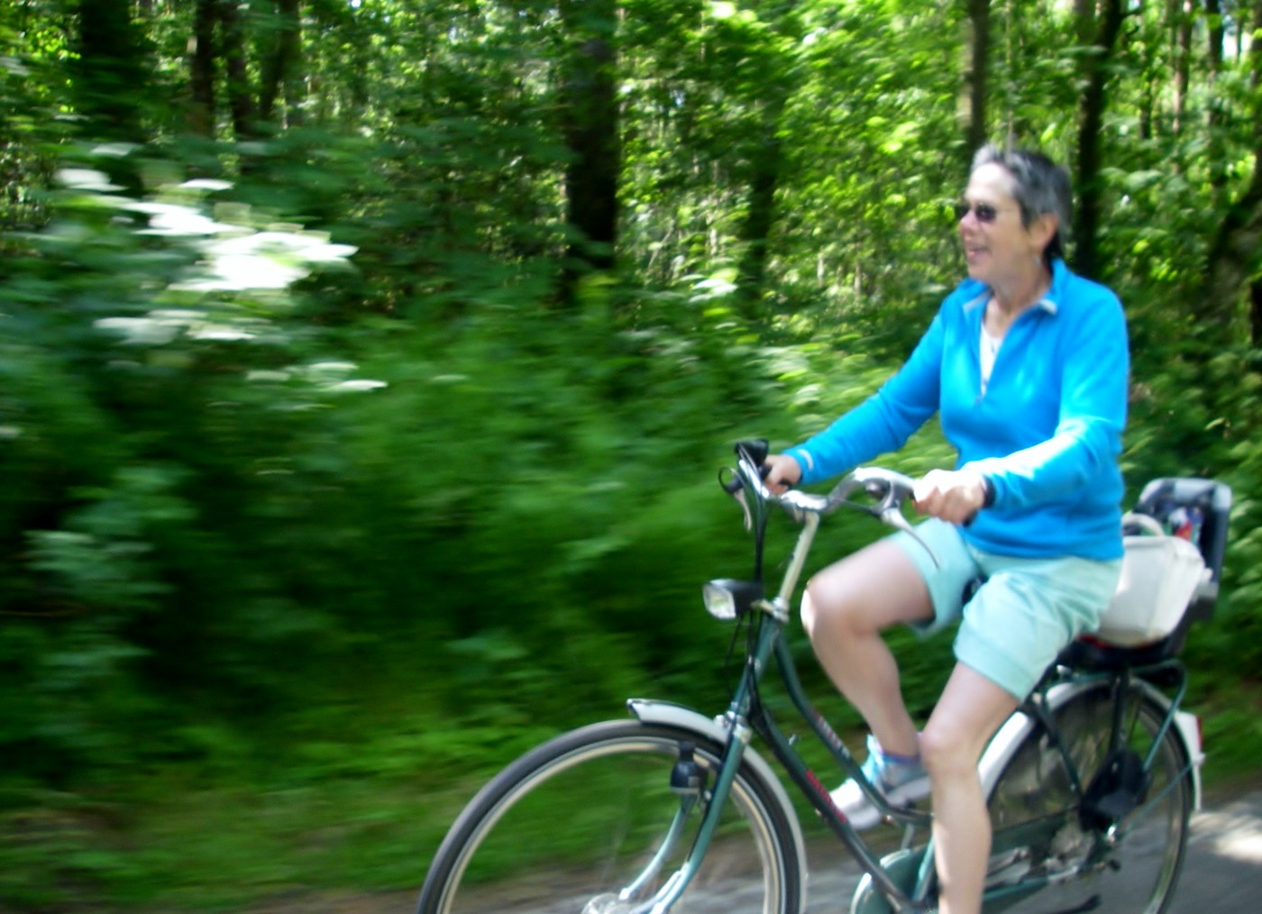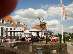 Our B&B had bikes for hire so we thought we would give it a try and save the effort of walking three miles to the farmhouse. The bike was a ‘traditional Dutch’ bike, upright with hub gears, uncomfortable saddle and weighing about as much as a tank. We had fun cycling along the pleasant road to meet, and also, say farewell to many of the other guests who had just stayed for the weekend. Plans to take our grandson out for a bike ride proved unsuccessful as he was too small for the child seat so after coffee & cake I set off to explore on the bike to explore the Dutch countryside. This was a successful, enjoyable, but very slow, bike ride. I particularly liked Wijk Bij Duurstede (it’s a place!) with its shady streets, cafes, canal and working windmill. Everywhere there were cyclists of all types, young and old, fast and slow, racers, tourists, families and older people. I had a go at keeping up with a group of racers but the behemoth I was riding simply wasn’t up to the job. Home via Amerongen and through the ‘green heart of Holland’ to the farm for more chat and naturally coffee & cake, with the few remaining guests (including son & grandson) and then, later, another lovely meal outside round the big table in the evening sunlight. Afterwards we had a nice ride to our B&B with the setting sun slanting through the trees.