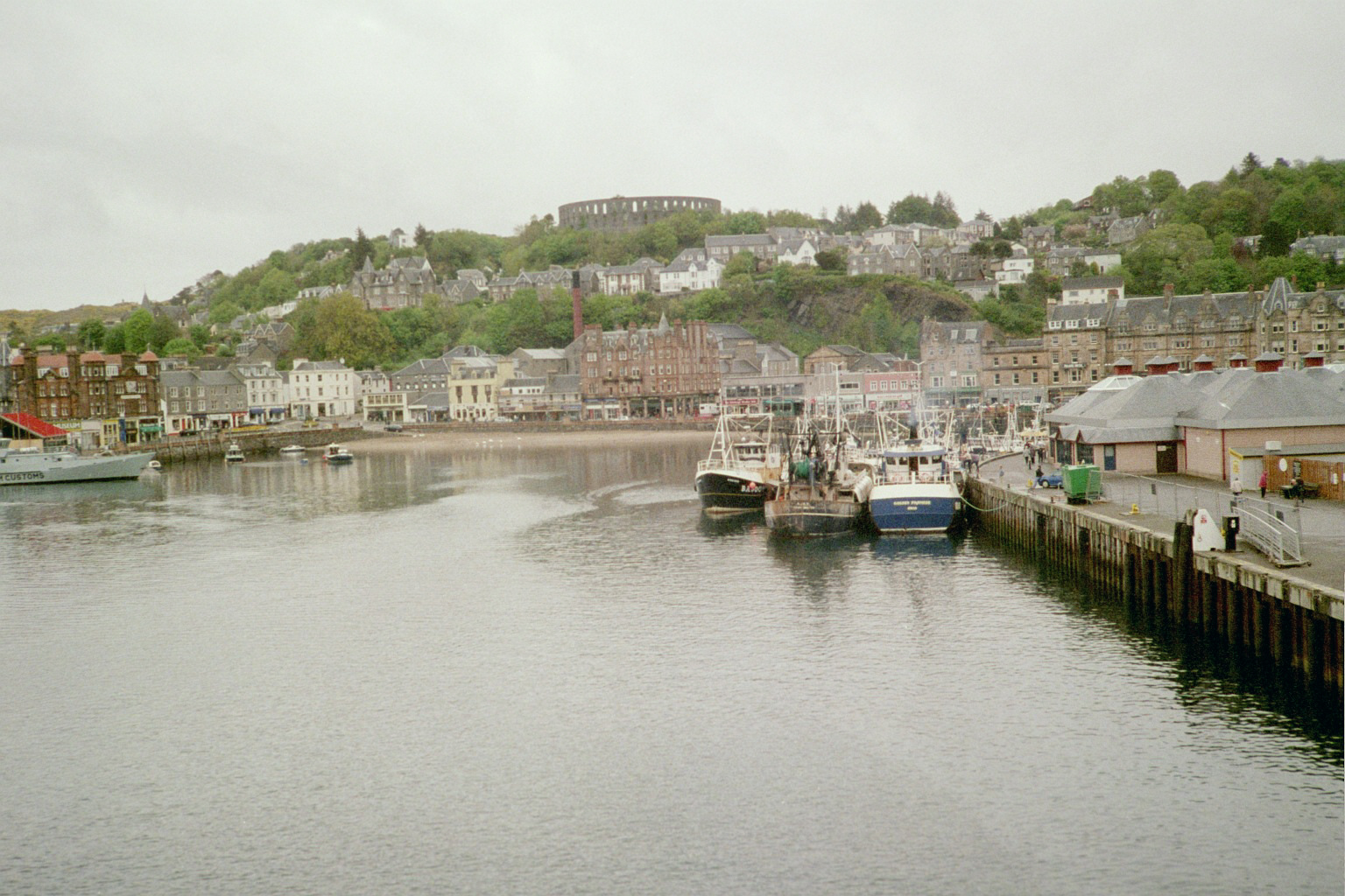 Then it was back on the bike to Oban under a lowering sky but the rains held off until I was almost there. The main road was scenic, smooth and gently graded so, with a slight tail wind, I did 38 miles in 2½ hours. The busy traffic spoiled it a bit; lots of lorries and at one point along Loch Etive I felt safer on the pavement (I met no pedestrians). I would find it hard to recommend this road to cyclists but I had a boat to catch so I stuck with it. Oban was busy and touristy; I checked out the ferry terminal and then found a nice warm coffee shop in the town centre for lunch. The warm bit was important, as I was a bit wet and soggy after the rain.