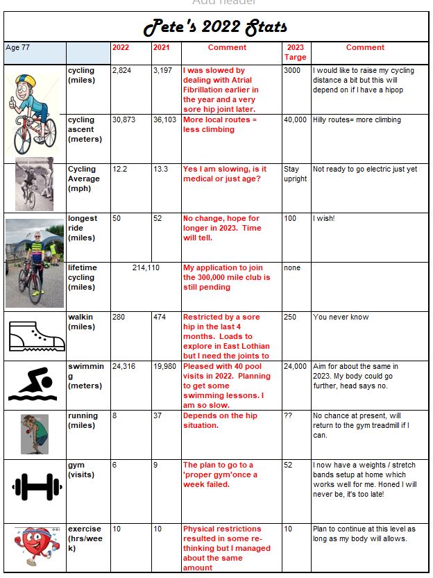 2022, cycling, Scotland, statistics, swimming, walkingActivity Stats 2022 © Peter Main – January 2023 Share this: Click to share on Facebook (Opens in new window) Facebook Click to share on Pinterest (Opens in new window) Pinterest More Click to share on WhatsApp (Opens in new window) WhatsApp Like Loading... Related